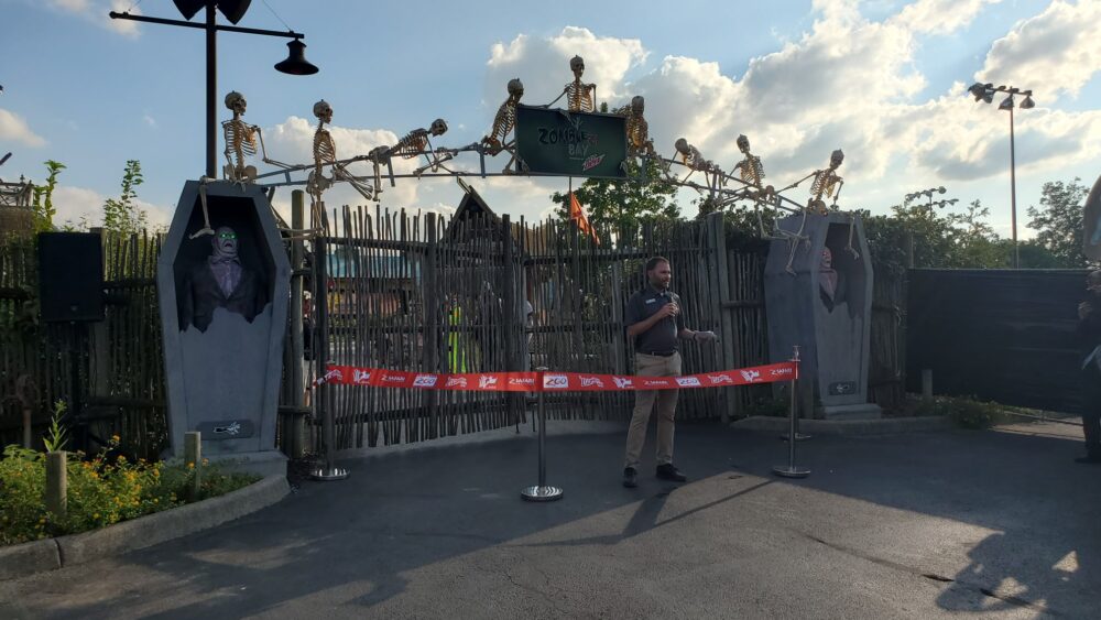 The terrifying fun began on Friday, Sept. 17, 2021 and continues to run on Friday, Saturday, and Sunday evenings through Sunday, October 31, plus Thursday evenings on October 14, 21, and 28. Hours are 6 p.m. – 10 p.m. on Thursdays and Sundays, and 6 p.m. – 12 a.m. on Fridays and Saturdays. Coaster enthusiasts should note Tidal Twist, the new Zamperla spinning coaster that opened earlier this summer, is not included in admission to ZOMBIEzi Bay.