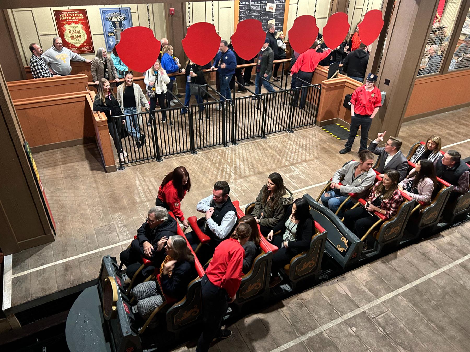 Riders began their experience by entering the Silver Dollar City pumper factory, where the town plans to unveil their new rescue wagons, built to transport firefighters to the scene of a fire.