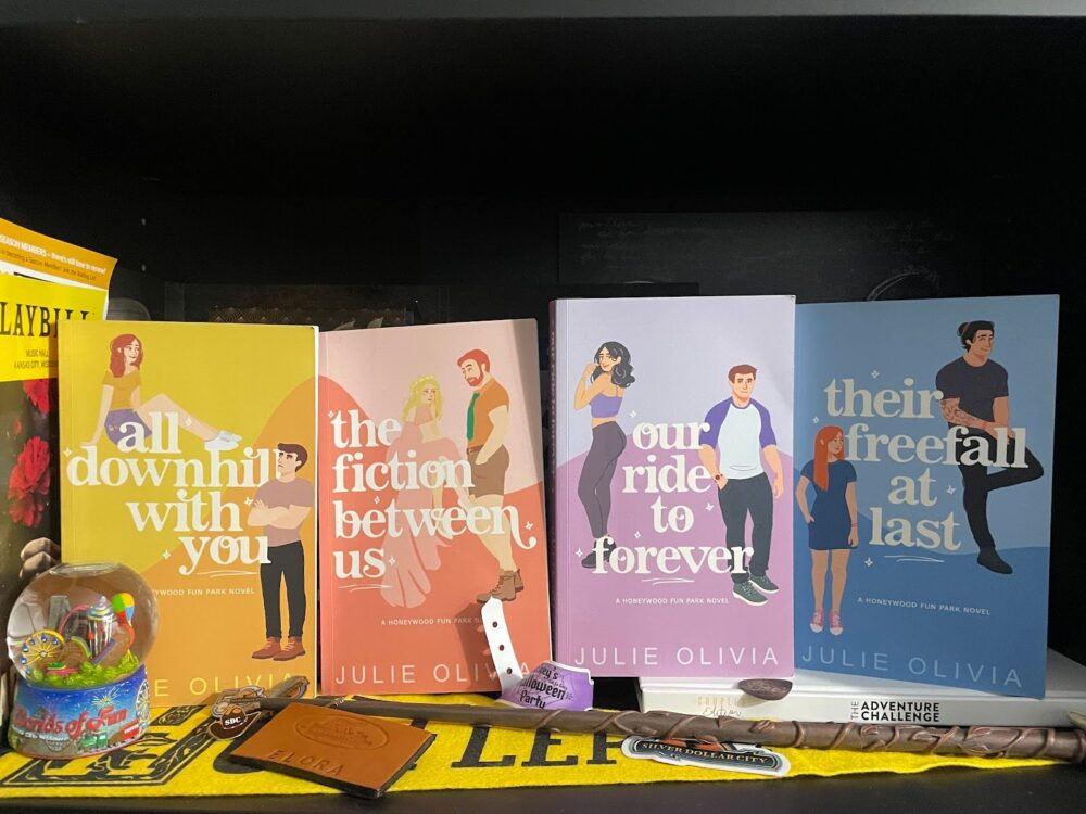 Finally, I have a wonderful series set in the fictional theme park of Honeywood theme park. The author, Julie Olivia, was inspired by her childhood visits to Dollywood and classic rom-com movies to create her own world complete with original theme park characters, rides, and park layout. There are four novels in this series. Again, these are meant for an older audience, so reader discretion is advised.