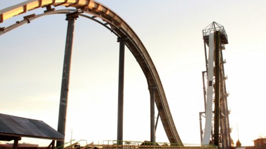 “Crews install the chain lift that will pull the trains up the first hill.”