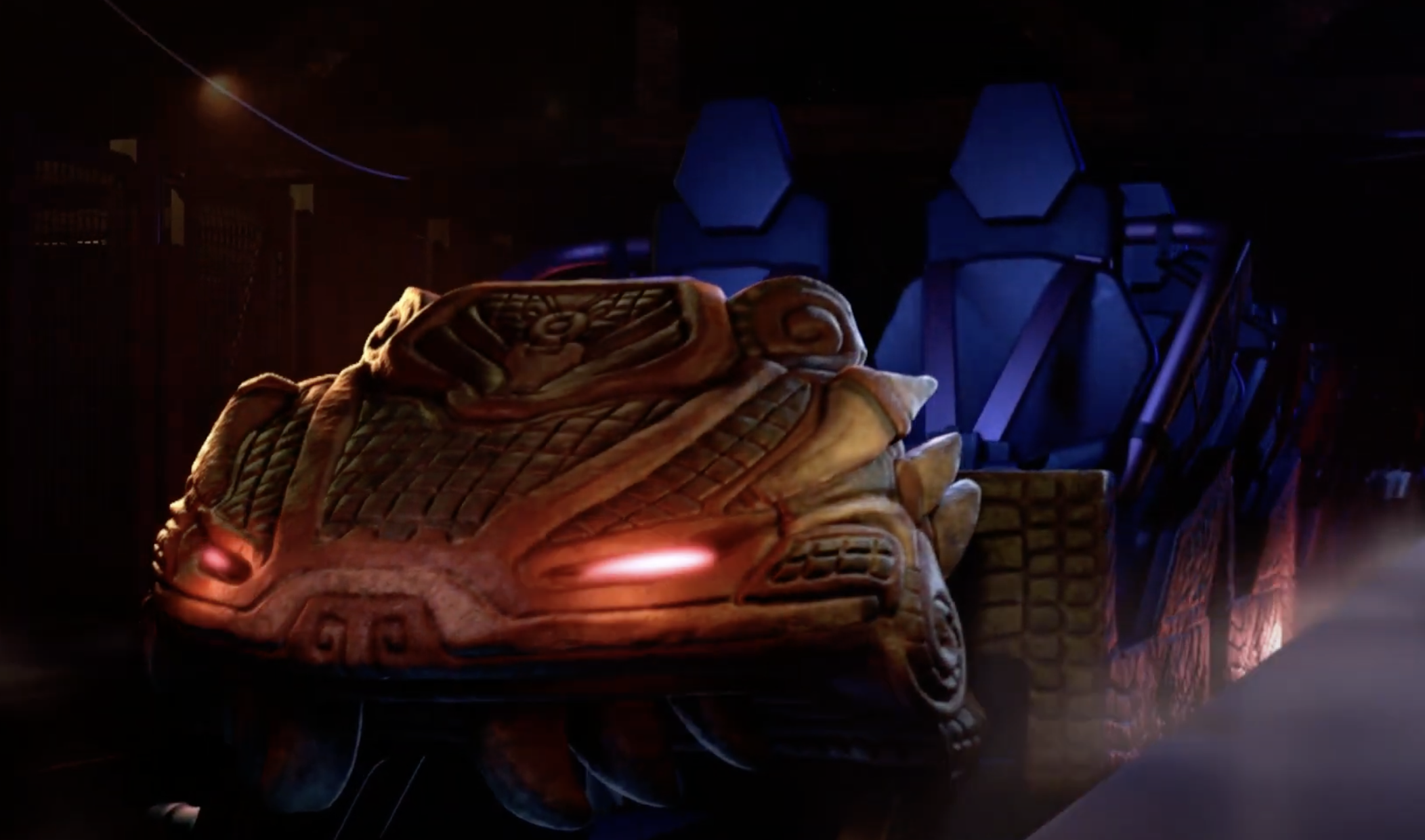 In the video, we get a look at what we’re assuming is the new train for MonteZOOMa: The Forbidden Fortress. While the front of the train is ornate and appears to feature LED eyes – absolutely a sharp and modern look perfect for a revitalization of a classic coaster – but it’s not where we’re focused. Look closely at the seats.