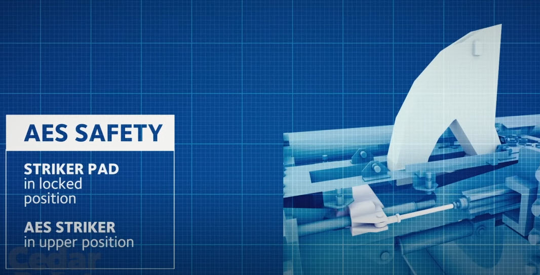 After the track tilts to the full vertical position, clamps pull the track and hold it tightly against the support structure so it doesn’t move. There are sensors fixed to the inside of the rails on the stationary and movable track to preciously check the position of the track to ensure the rails are aligned. If everything is good, the front bracket is lowered, the computer gives the OK to release the train, and the claw is released.