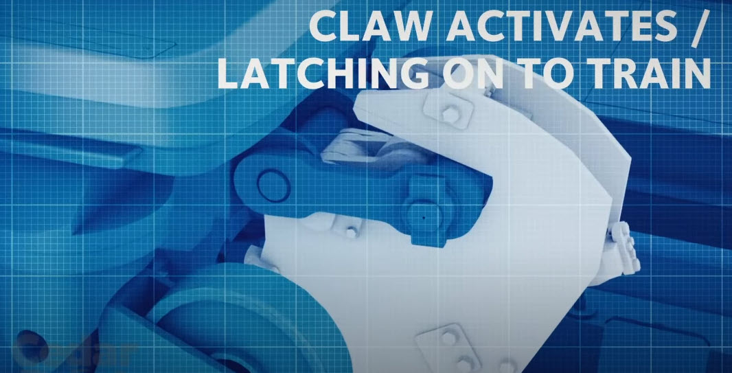 The primary holding mechanism that bears the weight of the train is the rear claw which latches onto a bar fixed to the last coach: