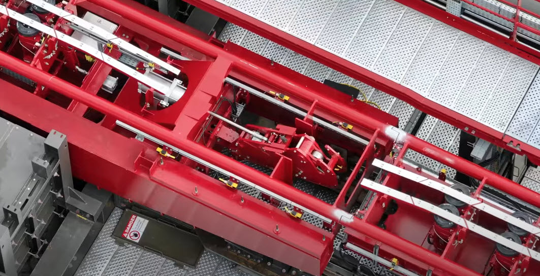 Once the claw is engaged and the computer gets the OK, the clamps holding the track in the horizontal position disengage, and hydraulic rams start rotating the track to the vertical position.
