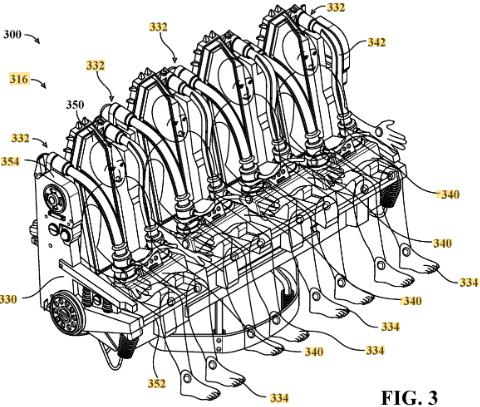 Monsters Unchained appears to be the next-generation version of Harry Potter and the Forbidden Journey – a KUKA RoboCoaster G2. Four seats are attached to the end of a robotic arm that runs along a two-dimensional track throughout a show building. The rumored major differences will be no projection domes and a round turntable load area rather than a linear one. The ride vehicles in the new renderings appear to match this patent file by Universal.