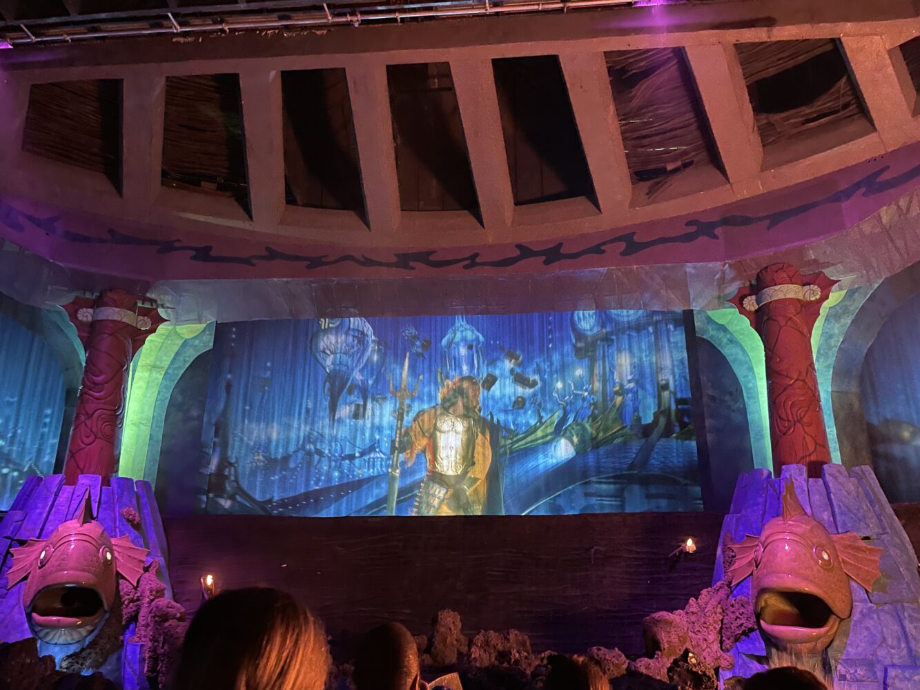 Here we met our guide, Taylor, and she was perfectly in character for the attraction, playing into the story just enough to fit the old school, sort of cheesy acting necessary without going over the top. I experienced Poseidon’s Fury three times, and the same actor was the guide for all three, so I also got to see some of the slight changes she made from show to show. I loved the storytelling in this room, and the reveal of a secret code around the walls of the room was all I needed to feel like I was in the middle of an epic adventure movie. All of my tours were also very full, and I am assuming this was only because it was the last day, many people in the crowd had “Poseidon’s Fury Last Tour” shirts and were very energetic throughout the tour, so I was happy I was with an audience that was excited.
