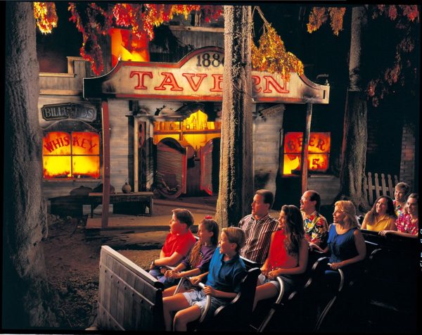 Once the train departs the station, guests move through a series of scenes depicting the Baldknobbers’ wreaking havoc on the town while it’s on fire, including the classic “Red Flanders” scene and the burning bridge scene.