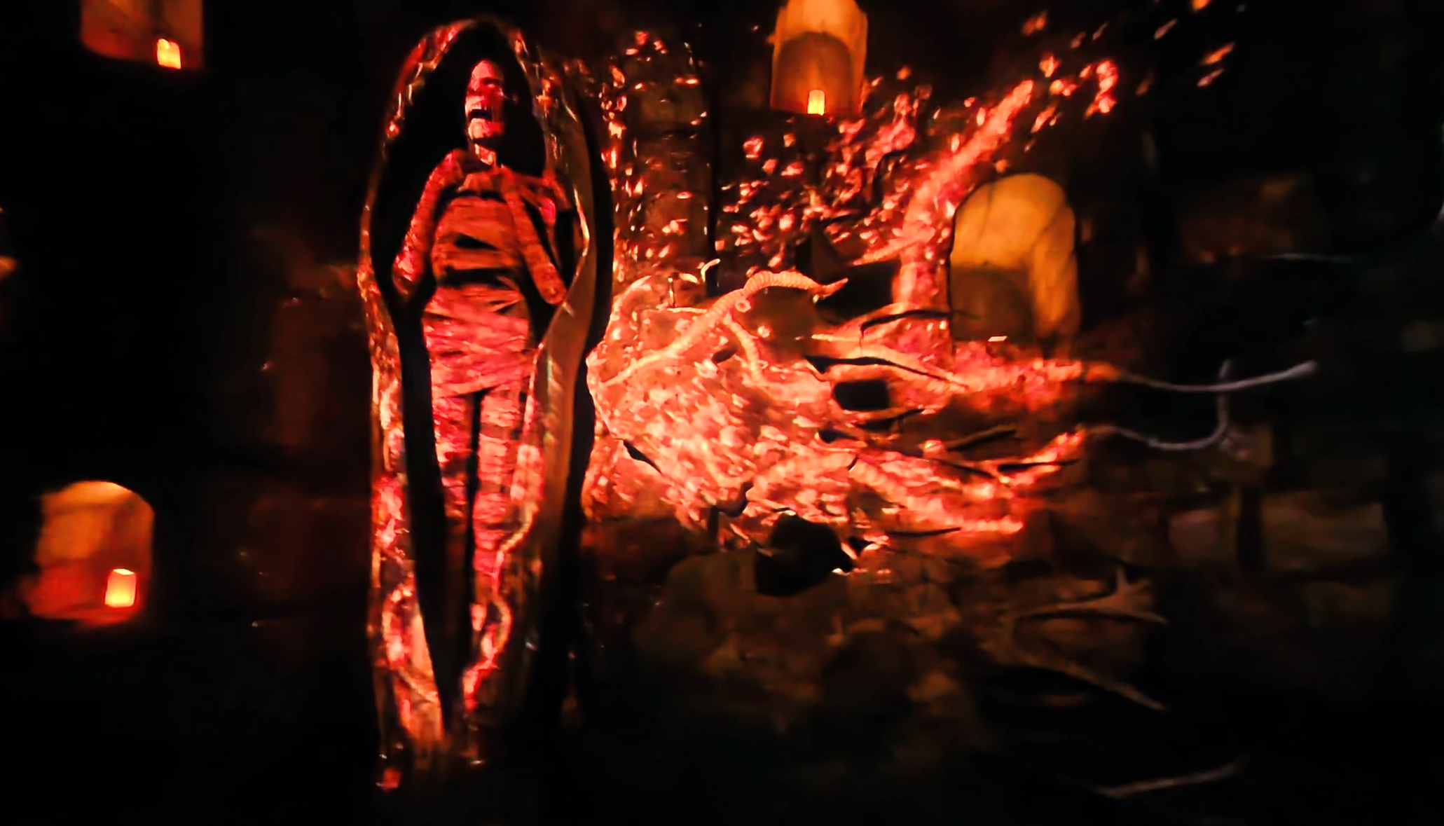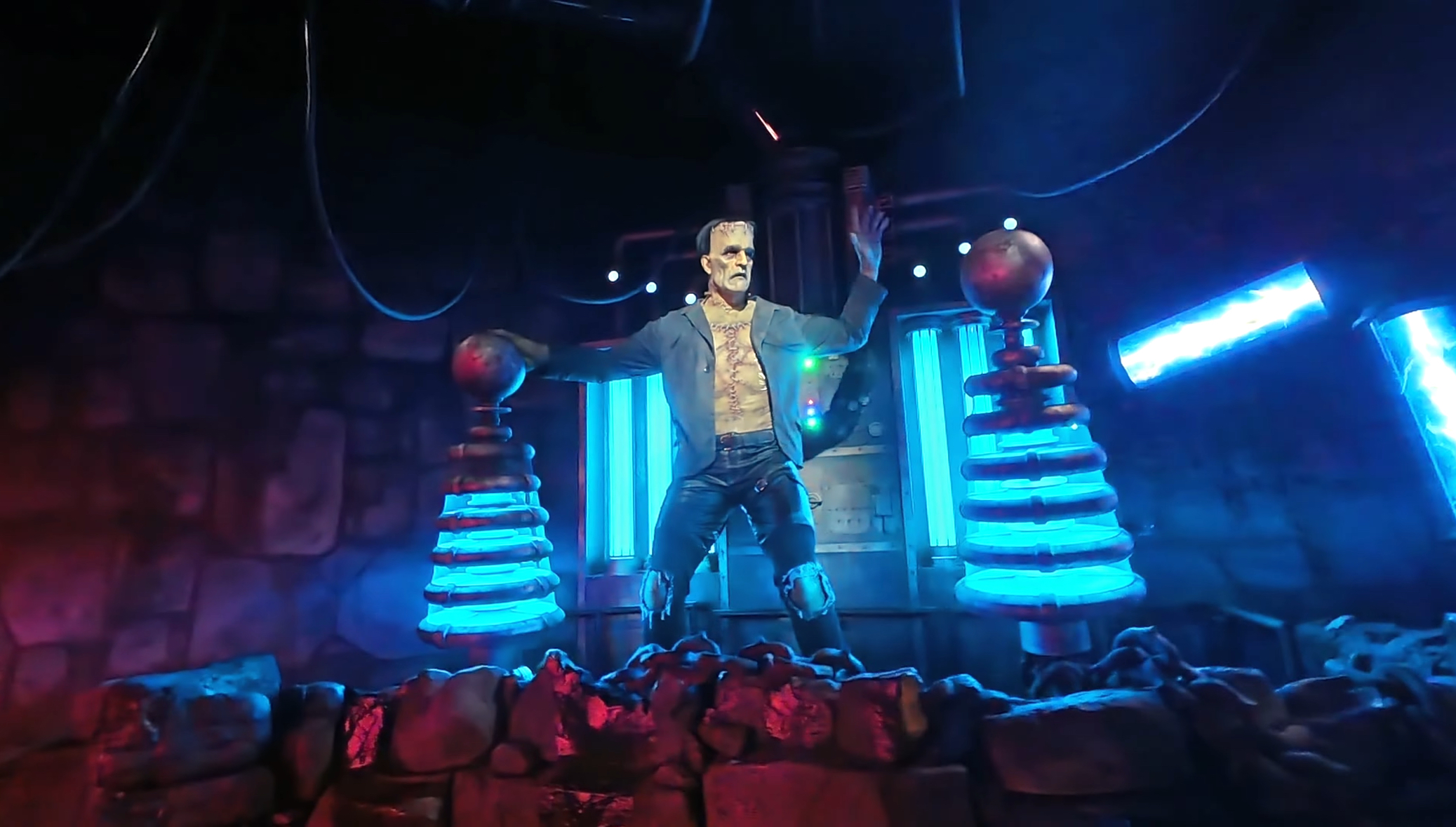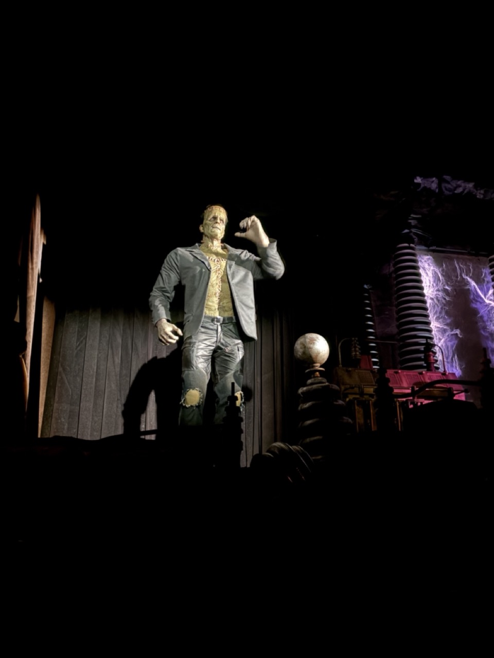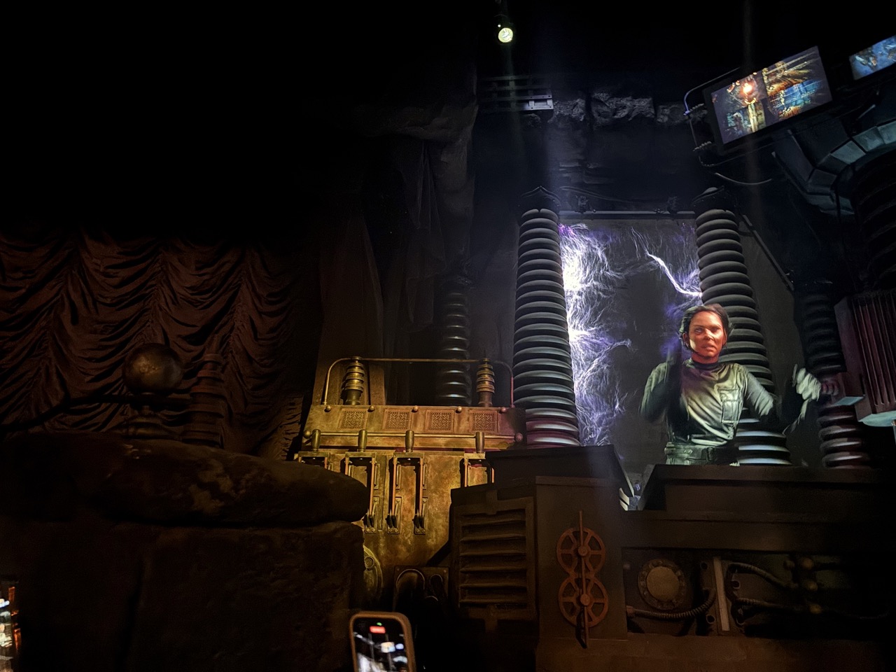 The second pre-show includes a life-sized Frankenstein’s monster animatronic that actually walks, and a Victoria Frankenstein animatronic with a projected face. This is the best use of the projected face I have seen, the lighting is programmed in a specific way to light the figure very realistically. Most guests probably would not know this is a projection. The rest of the animatronic is real, and the range of motion is amazing.