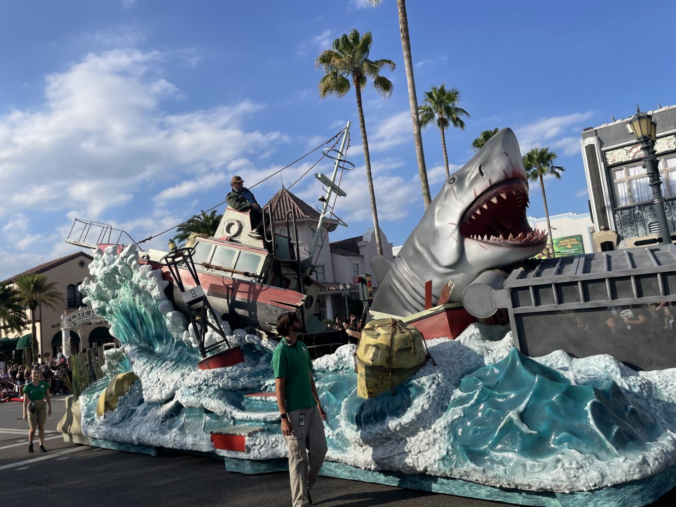 They are also playing along with the music coming from the float, which is also two tracks that feature in both the movie and the fan-favorite attraction that used to take up the back half of the park. Among the band is Mayor Vaughn and Chief Brody, who have hilarious -now viral- interactions with the crowd where the Mayor assures guests the beaches are safe, and Brody argues the opposite.