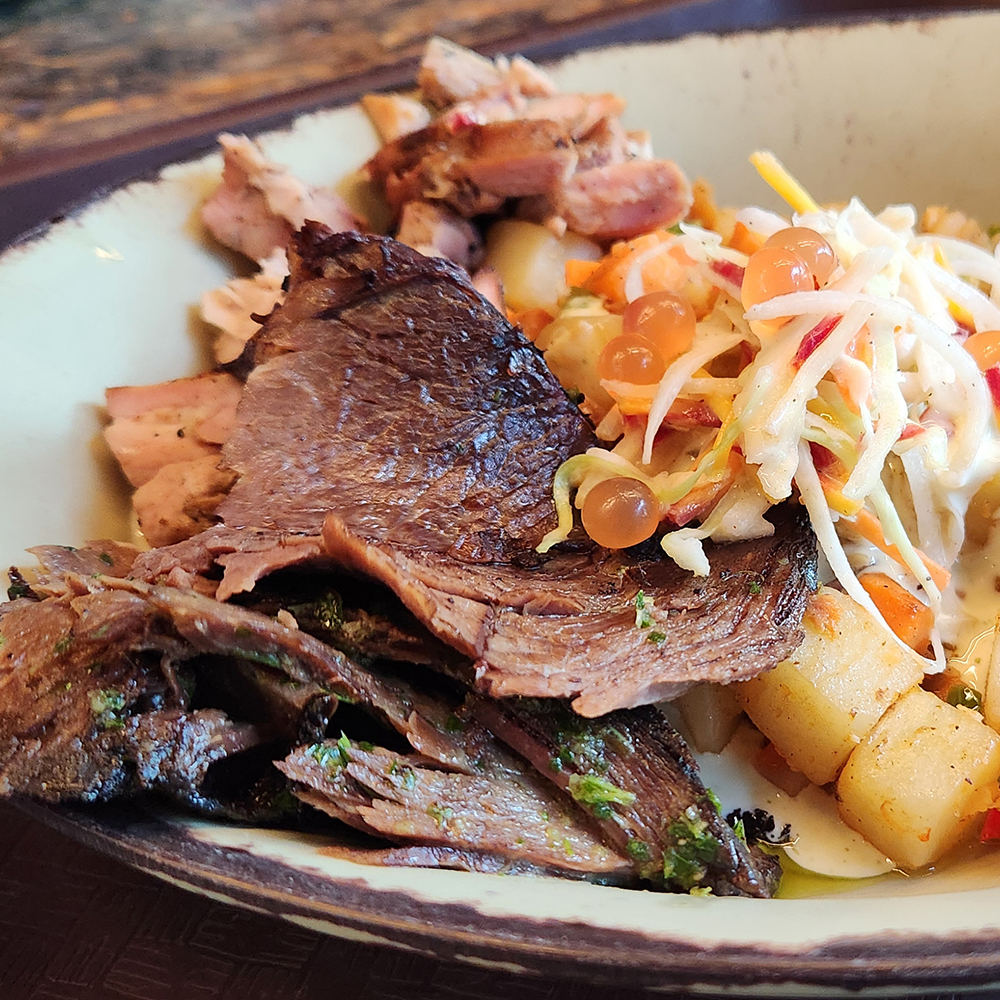Bowl bases include noodles, rice & beans, salad, and a red & sweet potato hash. After that you have the protein options of chimichurri beef, grilled chicken, chili-garlic shrimp, and tuna. Sauce choices include two vinaigrettes and a house made ranch dressing. You can top off your bowl with fruity boba balls and a vegetable slaw.