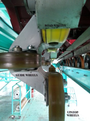 Road wheels bear the load or weight of the train and are subjected to the biggest loads, which is why they’re also called load wheels. The allowed vertical downward gs are greater than what is allowed for lateral or uplifting gs. Load wheels are usually also bigger in diameter as well.