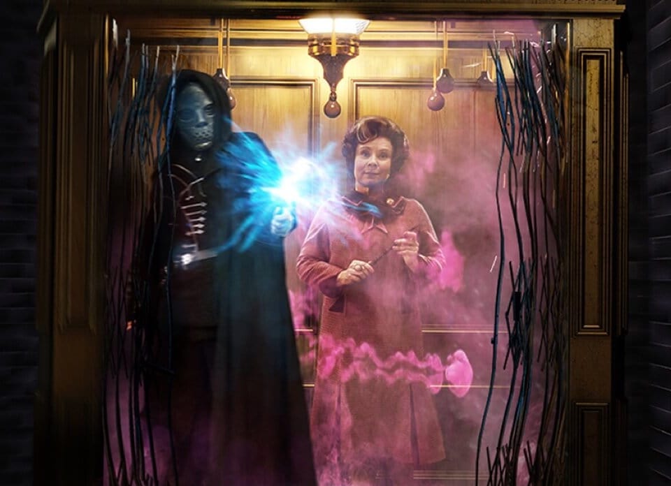Back inside the courtroom, Umbridge is on trial in front of Minister Kingsley Shacklebolt, and is once again put back into prison uniform as she is sentenced to Azkaban for her continued crime spree. Some of the animatronics in this ride, primarily in this scene, use projected faces. They aren’t perfect, and can dip into the uncanny valley a bit. However, the scenes are brief and the physical animatronics are very well-done.