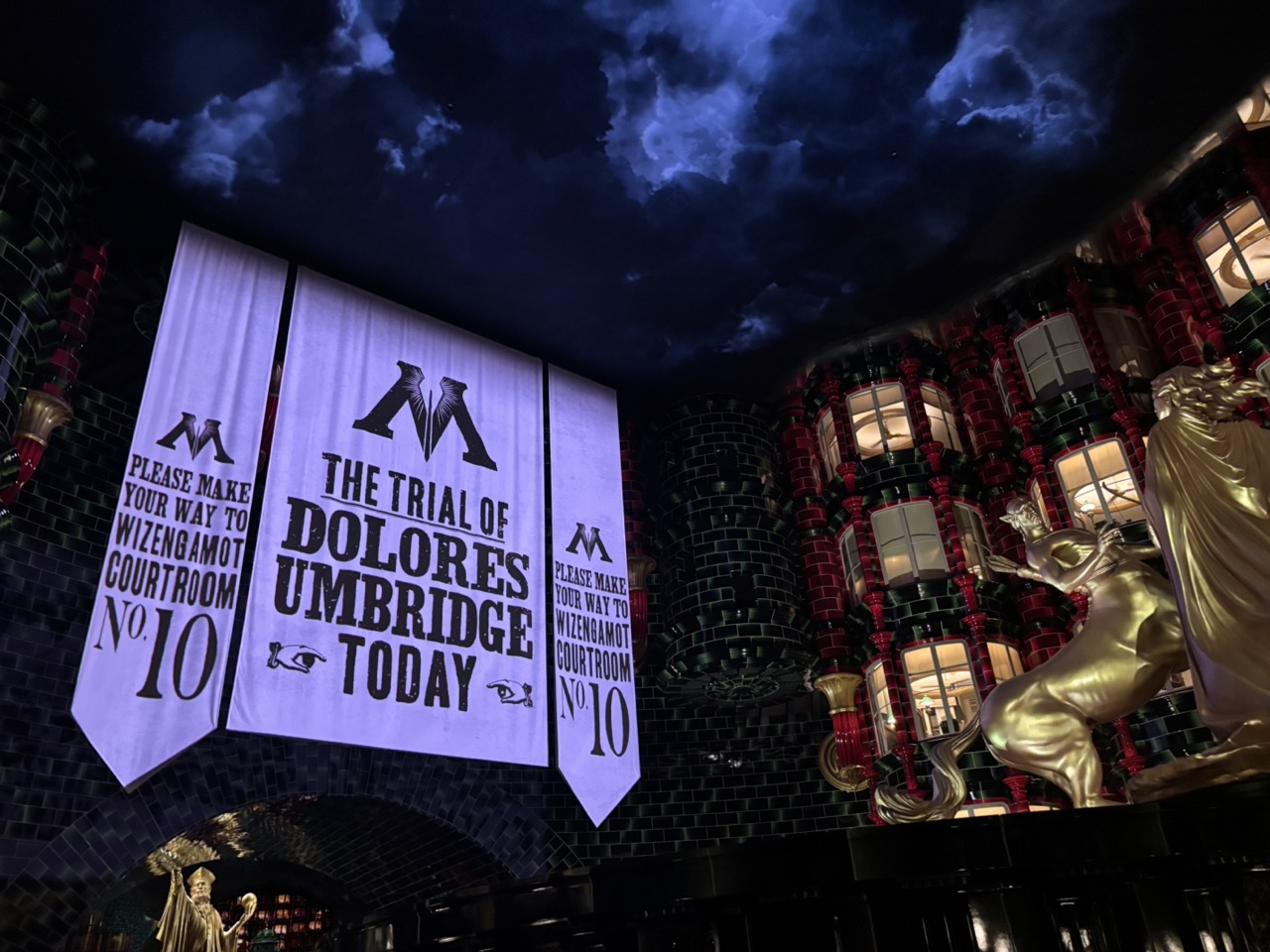 I was (pleasantly) surprised to see that all of the green marble tiles are actual, real marble. The quality of the queue is unbelievable, every inch has been meticulously crafted. The only minor disappointment with the interior of the Ministry is that the cloudy ceiling is a large screen. The concept art made it appear as physical clouds with maybe some projections or lighting incorporated. However, the giant Dolores Umbridge banner is amazing. I really can’t tell if this is a projection or some sort of LED tarp, I think it’s the latter because I looked around and could not see any projectors.