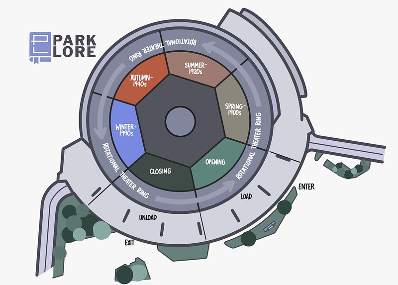 The theater is divided up into six-sections: four show scenes plus load and unload areas. Here’s a diagram of the Carousel of Progress from ParkLore. I’ve always wondered why another theme park attraction hasn’t tried to expand upon this concept but now it seems that is not the case anymore.
